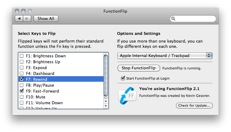 FunctionFlip is a great little Preference Pane that lets you use some function keys as function keys, while leaving other keys’ special features alone. This is great for Xcode 4 users, because Xcode 4’s default keyboard bindings map F6 to ‘step over" and F7 to “step into.” Because of this, I’ve enabled “Use all function keys as standard function keys” in System Preferences. It’s annoying, though, because I use the special keys a lot. I just don’t use them as much as I use the debug commands in Xcode.